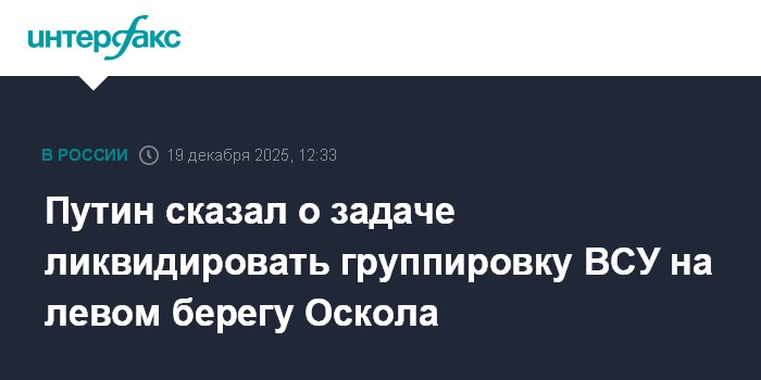 Москва. 19 декабря. INTERFAX.RU - Президент России Владимир Путин заявил, что перед российскими военнослужащими стоит задача ликвидировать группировку ВСУ на левом берегу реки Оскол и взять под контроль поселок Купянск-Узловой.