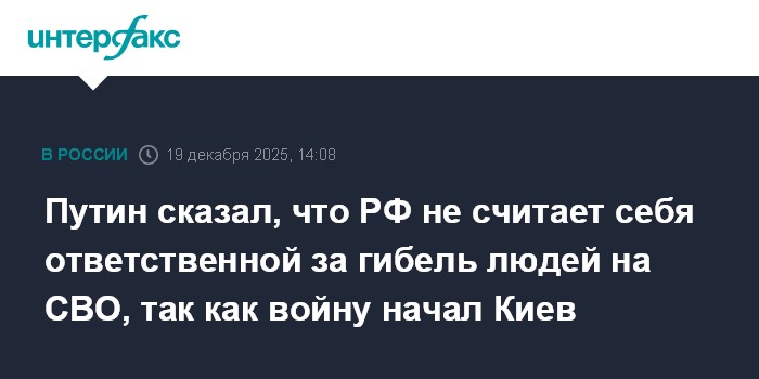 Москва. 19 декабря. INTERFAX.RU - Россия не считает себя ответственной за гибель людей на СВО, потому что войну начал Киев, заявил президент РФ Владимир Путин.