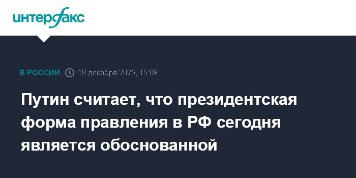 Москва. 19 декабря. INTERFAX.RU - Президентская форма правления в России является на сегодняшний день обоснованной, заявил глава государства Владимир Путин.