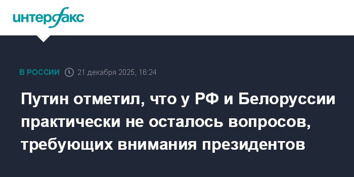 Москва. 21 декабря. INTERFAX.RU - Вопросов, требующих вмешательства президентов, у Москвы и Минска практически не осталось, заявил президент РФ Владимир Путин на встрече с белорусским коллегой Александром Лукашенко.