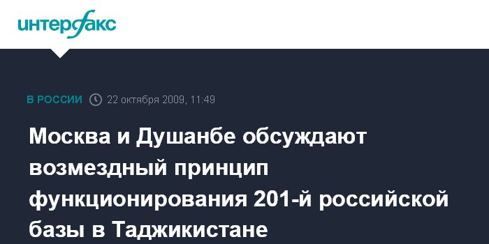 Москва. 22 октября. INTERFAX.RU - Минобороны РФ и МИД Таджикистана прорабатывают вопрос относительно оплаты функционирования 201-й российской военной базы (РВБ) в Таджикистане.