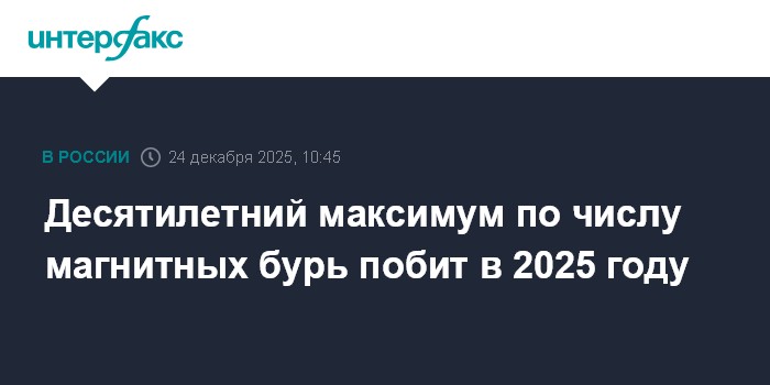 Москва. 24 декабря. INTERFAX.RU - Количество дней с магнитными бурями в 2025 году побило 10-летний максимум, также общее число геомагнитно-возмущенных дней достигло 20-летнего максимума. Об этом сообщили в среду в лаборатории солнечной астрономии Института космических исследований (ИКИ) и Института солнечно-земной физики (ИСЗФ) РАН.
