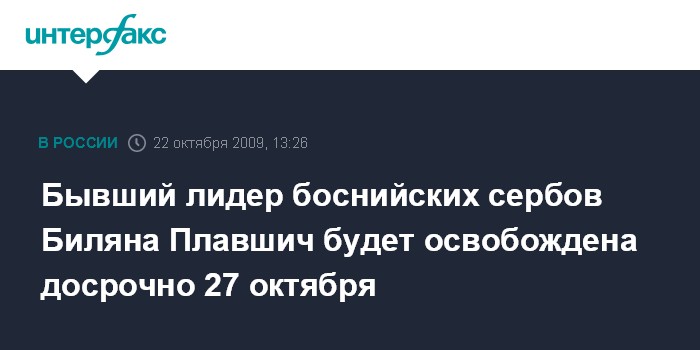 Москва. 22 октября. INTERFAX.RU - Бывший лидер боснийских сербов Биляна Плавшич, отбывающая в Швеции тюремное заключение по приговору Международного трибунала по бывшей Югославии (МТБЮ), может быть освобождена 27 октября, сообщает в четверг шведское министерство юстиции.