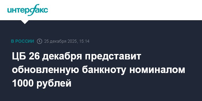 Москва. 25 декабря. INTERFAX.RU - Банк России 26 декабря представит обновленную банкноту номиналом 1000 рублей, сообщил ЦБ.