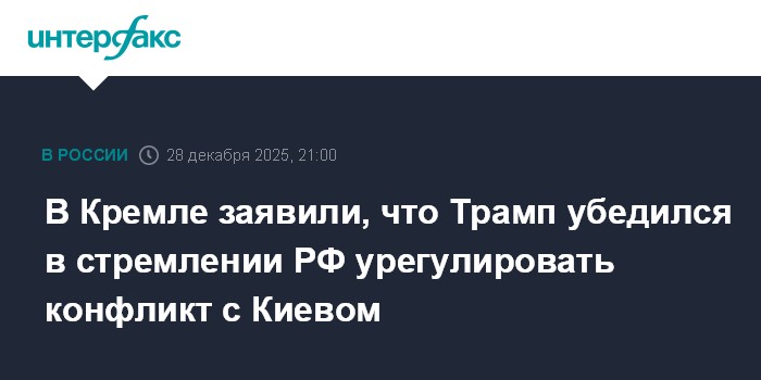 Москва. 28 декабря. INTERFAX.RU - Президент США Дональд Трамп заявил, что убедился в стремлении Москвы к политико-дипломатическому урегулированию украинского кризиса, и на этой основе планирует выстраивать переговоры с Владимиром Зеленским. Об этом сообщил журналистам помощник президента РФ Юрий Ушаков по итогам разговора Трампа с Владимиром Путиным.
