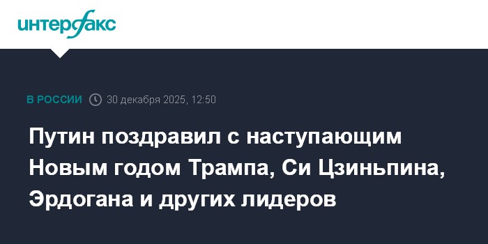 Москва. 30 декабря. INTERFAX.RU Президент РФ Владимир Путин поздравил с наступающим Новым годом и Рождеством зарубежных лидеров, включая президента США Дональда Трампа, председателя КНР Си Цзиньпина, турецкого коллегу Реджепа Тайипа Эрдогана и премьер-министра Индии Нарендру Моди.