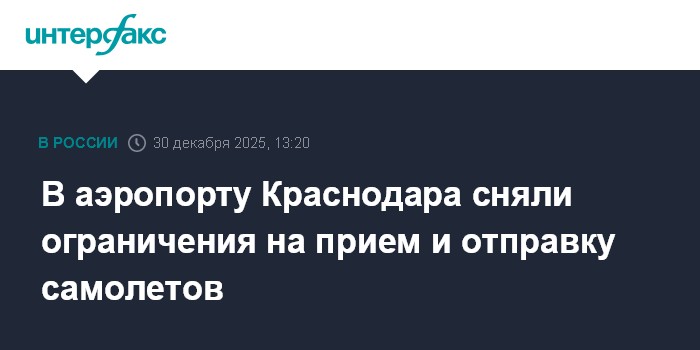 Москва. 30 декабря. INTERFAX.RU - Аэропорт Краснодара возобновил обслуживание рейсов, сообщил во вторник представитель Росавиации Артем Кореняко в своем телеграм-канале.
