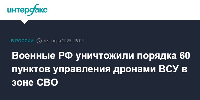 Москва. 4 января. INTERFAX.RU - Российские подразделения уничтожили в течение суток 58 пунктов управления беспилотниками украинской армии, сообщили в пресс-центрах группировок войск "Запад", "Восток" и "Южная" в воскресенье.