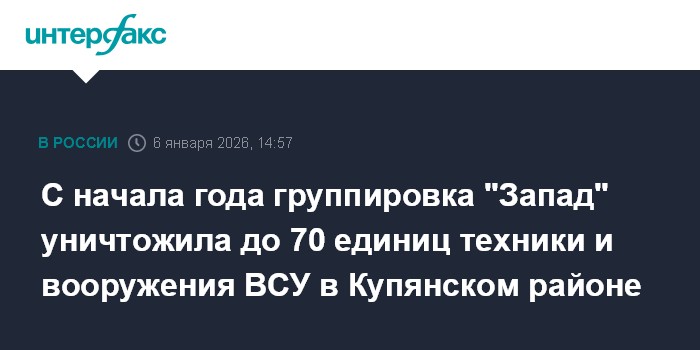Москва. 6 января. INTERFAX.RU - С начала января операторами дронов группировки "Запад" в Купянском районе Харьковской области уничтожено до 70 единиц техники и вооружения ВСУ, заявили в Минобороны РФ во вторник.