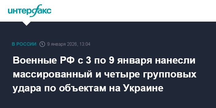 "С 3 по 9 января Вооруженными силами Российской Федерации нанесены массированный и четыре групповых удара, в результате которых поражены предприятия военной промышленности, объекты энергетики, транспортной, аэродромной и портовой инфраструктуры Украины, используемые в интересах ВСУ", - сказано в его сообщении, распространенном в пятницу.