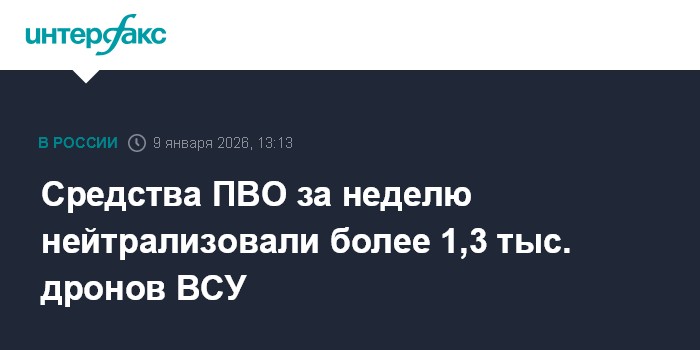Москва. 9 января. INTERFAX.RU - Российские средства ПВО за неделю сбили свыше 1,3 тыс. украинских беспилотников, сообщило в пятницу Минобороны РФ.