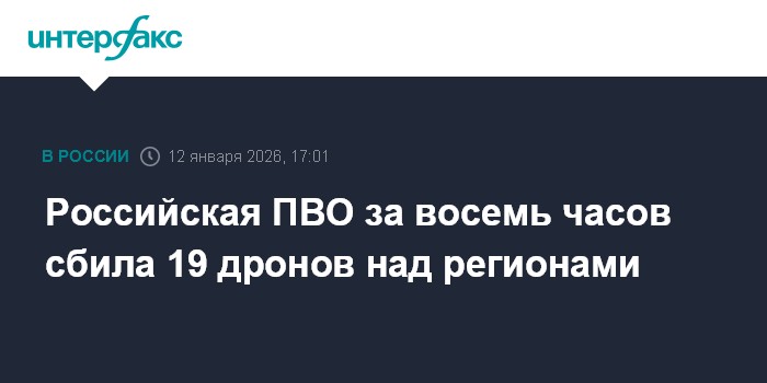 Москва. 12 января. INTERFAX.RU - Дежурные средства ПВО с 8:00 до 16:00 по московскому времени сбили 19 украинских беспилотников над российскими регионами и акваторией Азовского моря, сообщило Минобороны России.
