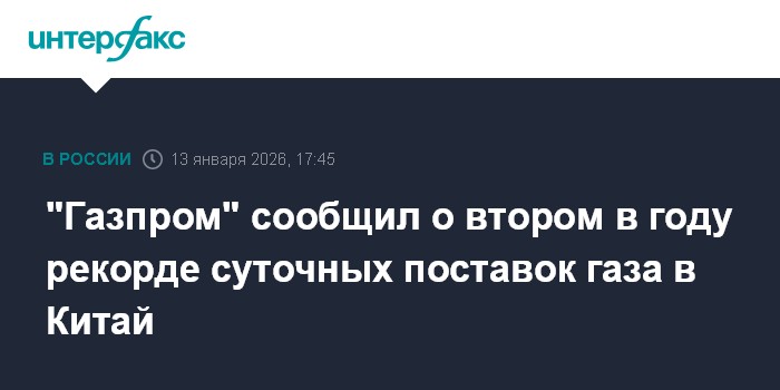 Москва. 13 января. INTERFAX.RU - "Газпром" сообщил о втором с начала 2026 года историческом рекорде суточных поставок газа в Китай по газопроводу "Сила Сибири". Новый рекорд установлен 12 января. Поставки российского газа идут в рамках долгосрочного Договора купли-продажи газа между "Газпромом" и CNPC, напоминают российские газовики.