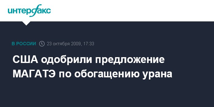 Москва. 23 октября. INTERFAX.RU - Руководство США в пятницу одобрило предложение Международного агентства по атомной энергии (МАГАТЭ) по обогащению урана для Ирана за рубежом, заявил представитель Совета национальной безопасности США Майк Хаммер.