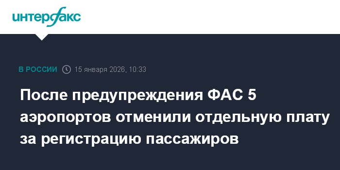 Москва. 15 января. INTERFAX.RU - Операторы аэропортов Волгограда, Горно-Алтайска, Калининграда, Сочи и Челябинска отменили отдельный тариф для авиакомпаний за использование платформы для регистрации пассажиров, исполнив, таким образом, предупреждение Федеральной антимонопольной службы.