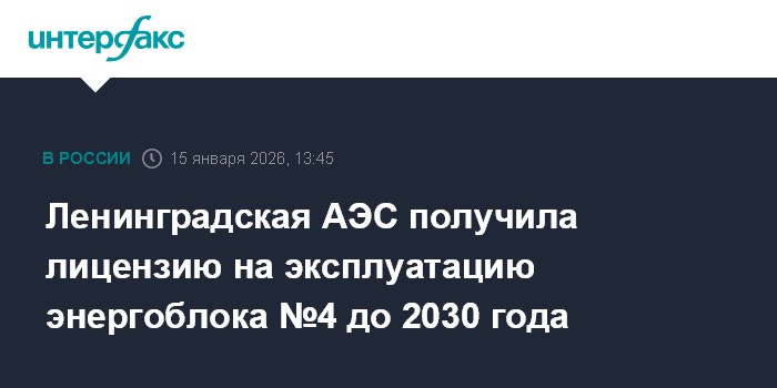 Москва. 15 января. INTERFAX.RU - Ленинградская АЭС (ЛАЭС, филиал АО "Концерн Росэнергоатом") получила лицензию Ростехнадзора на эксплуатацию энергоблока №4 РБМК-1000 до 2030 года, сообщило управление коммуникаций станции.