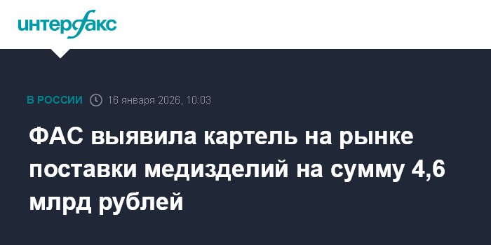 Москва. 16 января. INTERFAX.RU - Федеральная антимонопольная служба (ФАС) России выявила картель на сумму более 4,6 млрд рублей на торгах по поставке медицинских изделий, в том числе расходных материалов, лекарственных препаратов и диагностических реагентов, сообщили в пресс-службе ведомства в пятницу.
