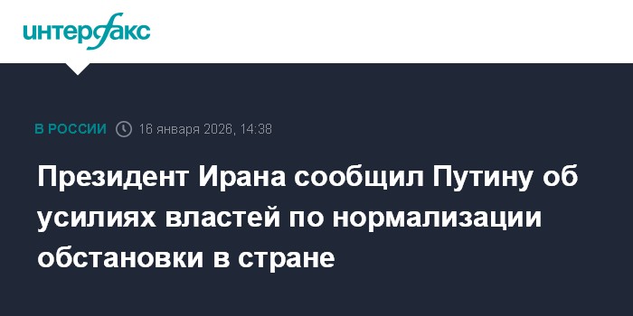 Москва. 16 января. INTERFAX.RU - В ходе телефонного разговора президент Исламской Республики Иран Масуд Пезешкиан проинформировал президента России Владимира Путина о предпринимаемых иранским руководством активных усилиях по нормализации обстановки в стране, сообщает в пятницу пресс-служба Кремля.