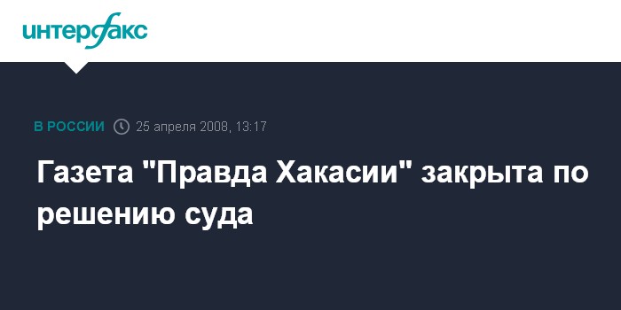 Абакан. 25 апреля. INTERFAX.RU - Верховный Суд Республики Хакасия удовлетворил иск управления Федеральной службы по надзору в сфере массовых коммуникаций, связи и охране культурного наследия по Красноярскому краю о ликвидации газеты "Правда Хакасии". Решение в законную силу пока не вступило и может быть обжаловано в Верховный Суд России, отмечается в сообщении.