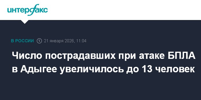 Москва. 21 января. INTERFAX.RU - Глава Адыгеи Мурат Кумпилов сообщил, что при ночной атаке БПЛА в Тахтамукайском районе республики пострадали 13 человек.