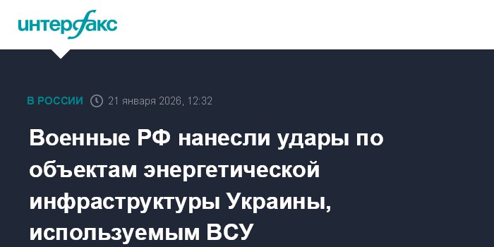 Москва. 21 января. INTERFAX.RU - Российская армия в течение суток нанесла удары по украинским энергетическим объектам, которые используются в интересах ВСУ, заявили в Минобороны РФ в среду.