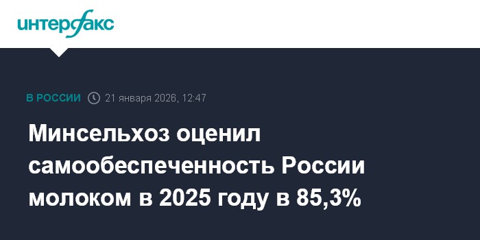 Москва. 21 января. INTERFAX.RU - Самообеспеченность России молоком в 2025 году достигла 85,3%, сообщается в презентации министра сельского хозяйства Оксаны Лут на III Форуме лидеров молочной индустрии.