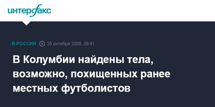 Лондон. 25 октября. INTERFAX.RU - Тела десяти человек - предположительно, похищенных игроков колумбийской футбольной команды - найдены на колумбийско-венесуэльской границе, сообщает в воскресенье британская телерадиокорпорация Би-би-си. По мнению представителей местных властей, за убийством спортсменов, похищенных две недели назад, могут стоять экстремисты из колумбийской радикальной организации "Армия национального освобождения".