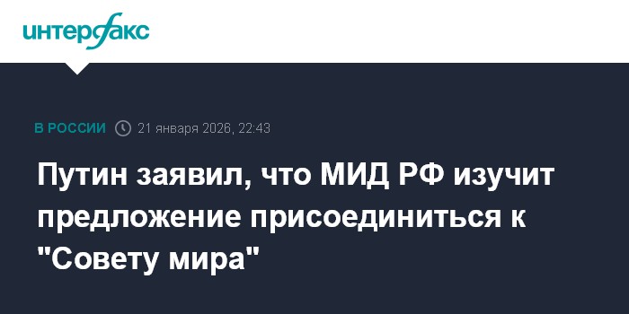Москва. 21 января. INTERFAX.RU - МИД РФ изучит документы по приглашению России в "Совет мира", проконсультируется со стратегическими партнерами и после этого даст ответ США, заявил президент РФ Владимир Путин.