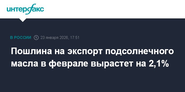 Москва. 23 января. INTERFAX.RU - Пошлина на экспорт подсолнечного масла из России в феврале 2026 года повысится на 2,1%, до 9 495 рублей с 9 298,6 рубля за тонну в январе. На подсолнечный шрот пошлина второй месяц подряд будет нулевой. Такой расчет представил Минсельхоз.