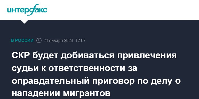 Москва. 24 января. INTERFAX.RU - Следственный комитет РФ (СКР) намерен добиваться уголовного преследования судьи в Самарской области, вынесшего оправдательный приговор по делу о нападении мигрантов на местных жителей, включая депутата Госдумы РФ, сообщили в ведомстве.
