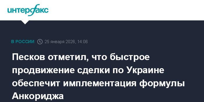 Москва. 25 января. INTERFAX.RU - Быстрое продвижение мирной сделки по Украине можно будет обеспечить, как только формула решения территориальных вопросов, выработанная в Анкоридже, будет имплементирована, заявил пресс-секретарь президента РФ Дмитрий Песков.