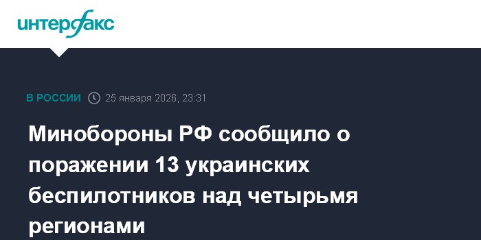Москва. 25 января. INTERFAX.RU - Минобороны РФ сообщило, что с 20:00 до 23:00 по Москве дежурными средствами ПВО были перехвачены и уничтожены 13 украинских беспилотных летательных аппаратов самолетного типа.
