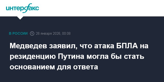 Москва. 26 января. INTERFAX.RU - Атака БПЛА на резиденцию президента РФ в конце 2025 года могла бы стать поводом для ответного удара, в том числе "с применением специального оружия", заявил зампред Совбеза России Дмитрий Медведев.