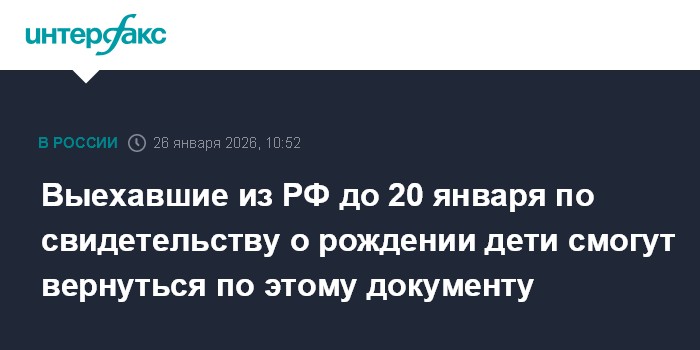 "Дети, не достигшие 14-летнего возраста, которые выехали из страны по свидетельству о рождении до вступления в силу указанных требований (до 20 января 2026 года), смогут вернуться по нему в Российскую Федерацию", - говорится в сообщении, размещенном в официальном телеграм-канале Миграционной службы МВД РФ.