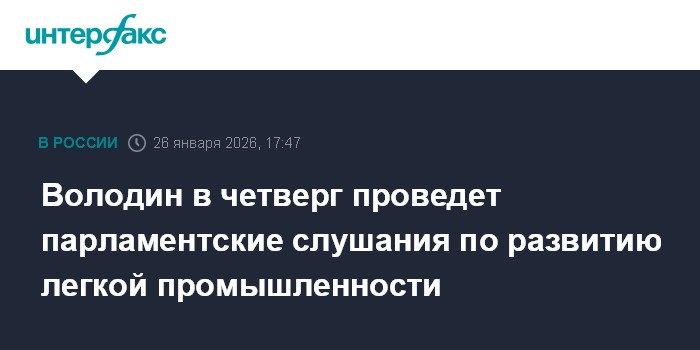 Москва. 26 января. INTERFAX.RU - В четверг 29 января председатель Госдумы Вячеслав Володин проведет большие парламентские слушания на тему развития отраслей легкой промышленности в РФ, сообщили в пресс-службе палаты российского парламента.