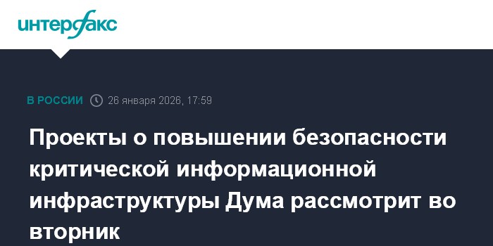 Москва. 26 января. INTERFAX.RU - Госдума во вторник рассмотрит законопроекты, направленные на повышение безопасности критической информационной инфраструктуры, сообщил председатель Госдумы Вячеслав Володин.