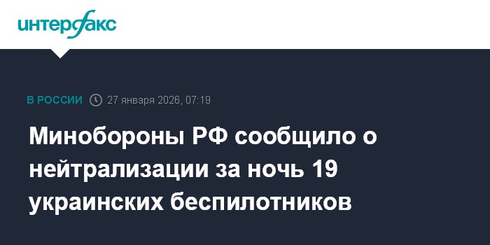Москва. 27 января. INTERFAX.RU - Министерство обороны РФ заявило, что в течение прошедшей ночи перехвачены и уничтожены 19 украинских беспилотных летательных аппаратов самолетного типа.