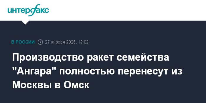 Москва. 27 января. INTERFAX.RU - Заместитель гендиректора "Роскосмоса" по ракетным проектам Дмитрий Баранов сообщил, что производство ракет-носителей семейства "Ангара" полностью перенесут из московской площадки Центра Хруничева в Омск.