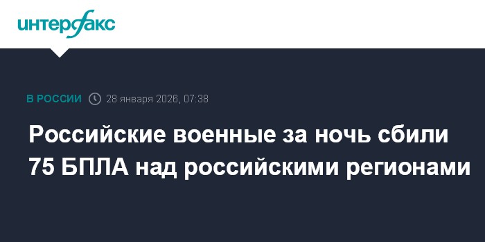 Москва. 28 января. INTERFAX.RU - Минобороны РФ сообщило о нейтрализации 75 беспилотников за ночь над российскими регионами.