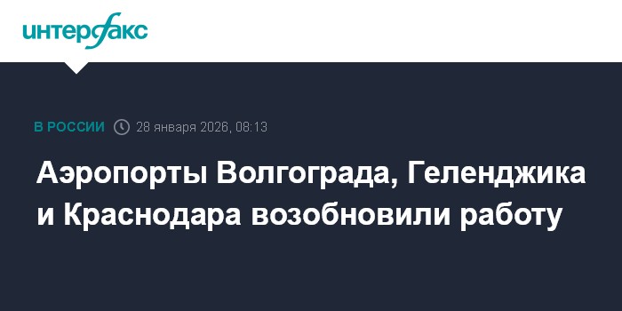 Москва. 28 января. INTERFAX.RU - Временные ограничения на прием и выпуск воздушных судов сняты в аэропортах Волгограда ("Гумрак"), Геленджика и Краснодара ("Пашковский"), сообщила пресс-служба Росавиации в своем телеграм-канале.