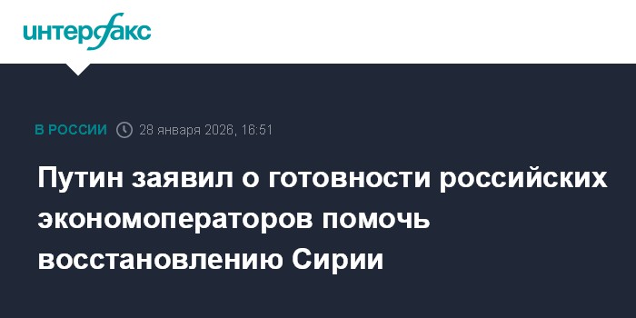 Москва. 28 января. INTERFAX.RU - Президент России Владимир Путин на переговорах в Кремле поздравил временного президента Сирии Ахмеда аш-Шараа с успехами на пути восстановления территориальной целостности страны и сообщил о готовности российских экономических операторов готовы содействовать восстановлению экономики Сирии.
