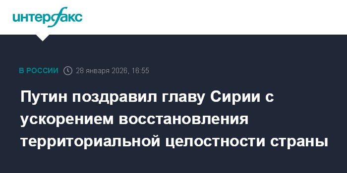 Москва. 28 января. INTERFAX.RU - Президент РФ Владимир Путин на переговорах в Кремле в среду поздравил временного президента Сирии Ахмеда аш-Шараа с успехами на пути восстановления территориальной целостности страны.