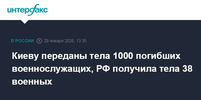 Москва. 29 января. INTERFAX.RU - Россия передала Украине тела тысячи погибших военнослужащих ВСУ, взамен получила 38 тел российский военных, сообщил помощник президента РФ Владимир Мединский.