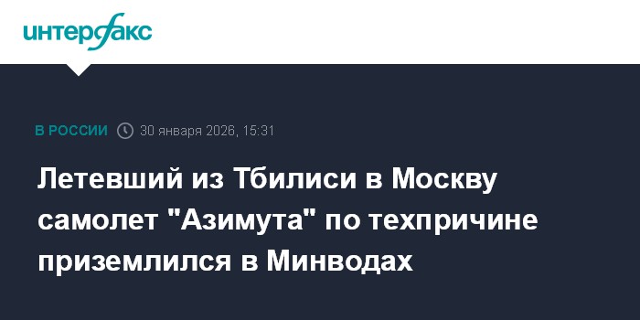 Москва. 30 января. INTERFAX.RU - Самолет авиакомпании "Азимут", летевший из Тбилиси в московский аэропорт "Внуково" по технической причине совершил посадку на запасном аэродроме в Минеральных Водах, пассажиров вывезут в Москву резервным бортом, сообщил авиаперевозчик.