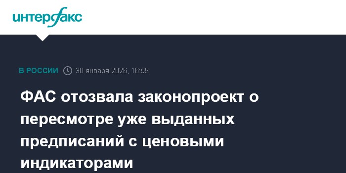 Москва. 30 января. INTERFAX.RU - Федеральная антимонопольная служба отозвала законопроект № 632373-8, который давал ей право пересматривать старые предписания и менять в них условия ценообразования, если в нем использовались мировые индикаторы, в новой ситуации не соответствующие общим условиям обращения товара.