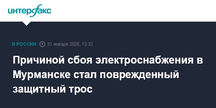 Москва. 31 января. INTERFAX.RU - Специалисты установили причину нарушения электроснабжения в Мурманске и ЗАТО Североморск, которое возникло в субботу утром - на линии выявлено повреждение защитного троса, сообщил губернатор Мурманской области Андрей Чибис.