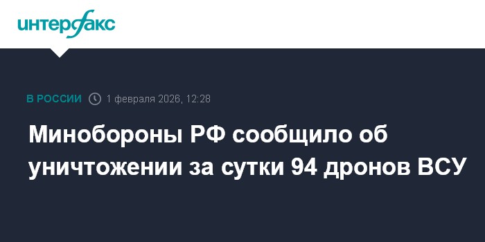 Москва. 1 февраля. INTERFAX.RU - Российские военные уничтожили за сутки 94 украинских беспилотника самолетного типа, сообщило Минобороны РФ в воскресенье.
