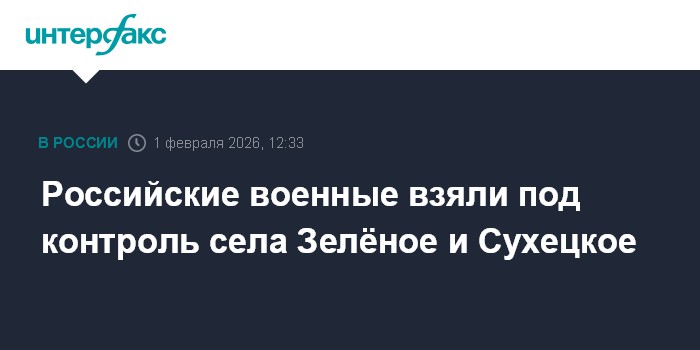 Москва. 1 февраля. INTERFAX.RU - Вооруженные силы России взяли под контроль два села - Зелёное в Харьковской области и Сухецкое в ДНР, сообщило министерство обороны РФ в воскресенье.
