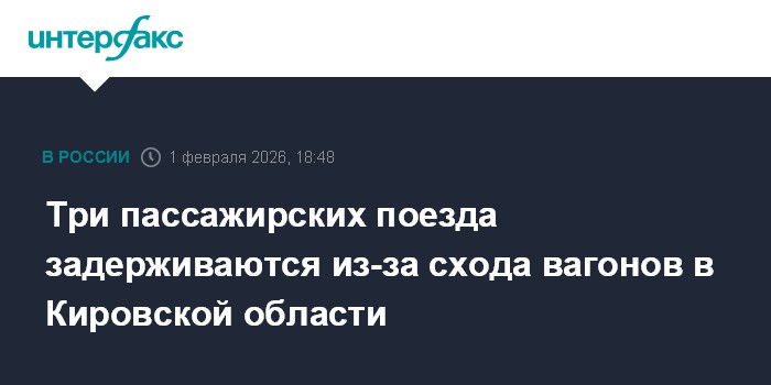 Москва. 1 февраля. INTERFAX.RU - Три поезда дальнего следования отстают от графика движения в связи со сходом грузовых вагонов на перегоне Оричи - Шалегово в Кировской области, сообщается в телеграм-канале филиала РЖД - Горьковская железная дорога в воскресенье.