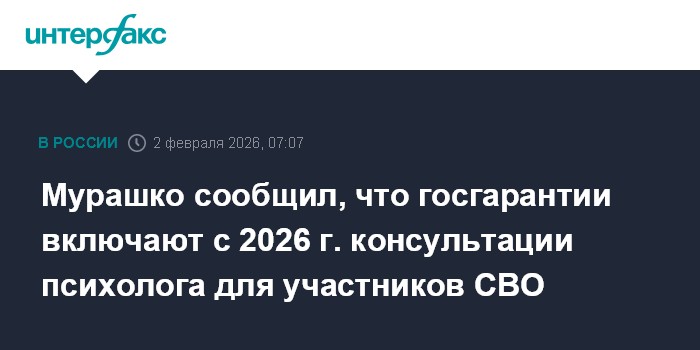Москва. 2 февраля. INTERFAX.RU - Программа госгарантий бесплатного оказания медпомощи в России с текущего года включает возможность получения участниками специальной военной операции (СВО) консультации медицинского психолога, сообщил министр здравоохранения РФ Михаил Мурашко.